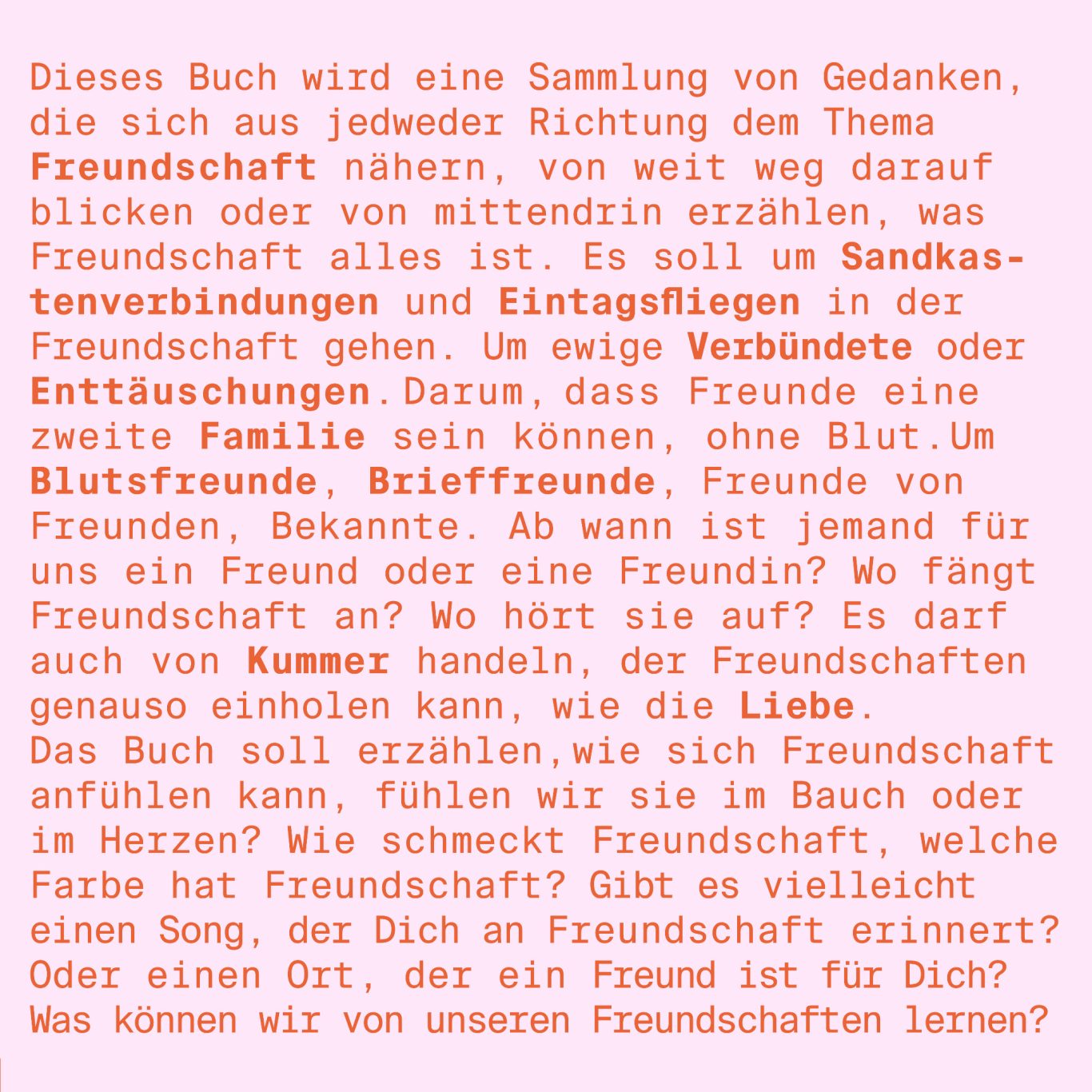 Dieses Buch wird eine Sammlung von Gedanken, die sich aus jedweder Richtung dem Thema Freundschaft nähern, von weit weg darauf blicken oder von mittendrin erzählen, was Freundschaft alles ist. Es soll um Sandkastenverbindungen und Eintagsfliegen in der Freundschaft gehen. Um ewige Verbündete oder Enttäuschungen. Darum, dass Freunde eine zweite Familie sein können, ohne Blut. Um Blutsfreunde, Brieffreunde, Freunde von Freunden, Bekannte. Ab wann ist jemand für uns ein Freund oder eine Freundin? Wo fängt Freundschaft an? Wo hört sie auf? Es darf auch von Kummer handeln, der Freundschaften genauso einholen kann, wie die Liebe. Das Buch soll erzählen, wie sich Freundschaft anfühlen kann, fühlen wir sie im Bauch oder im Herzen? Wie schmeckt Freundschaft, welche Farbe hat Freundschaft? Gibt es vielleicht einen Song, der Dich an Freundschaft erinnert? Oder einen Ort, der ein Freund ist für Dich? Was können wir von unseren Freundschaften lernen?