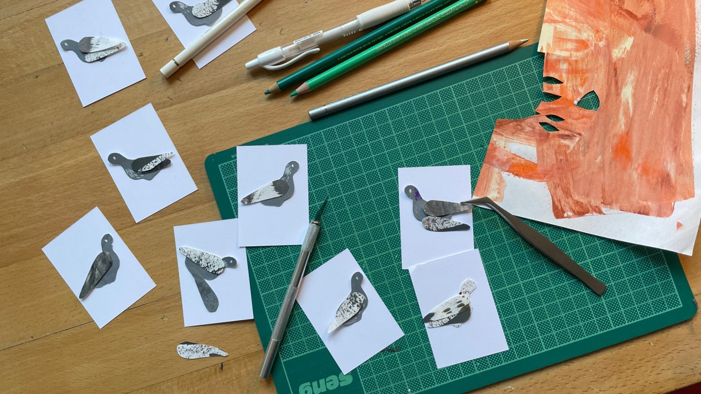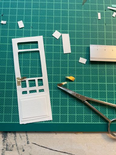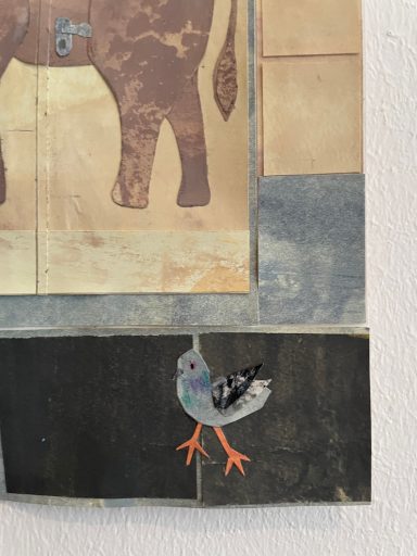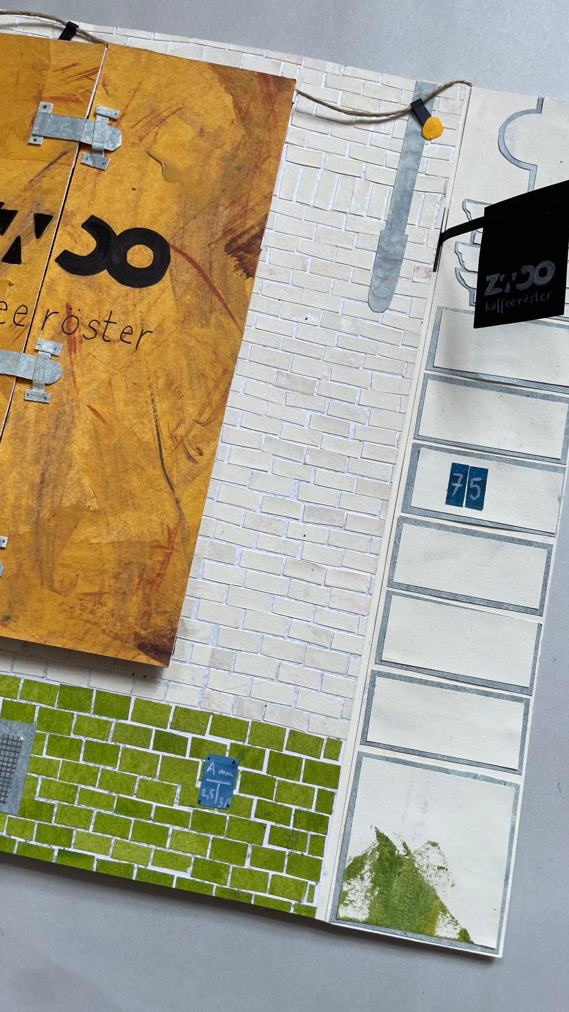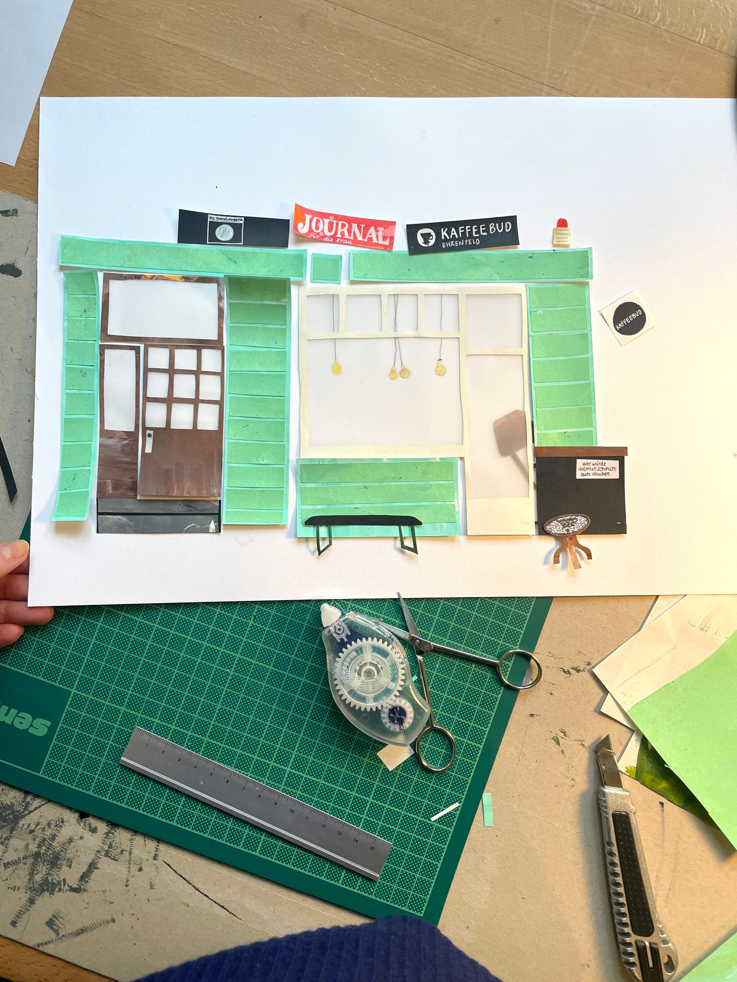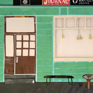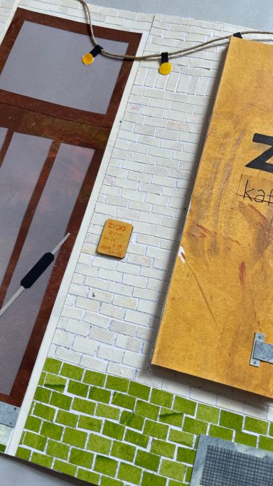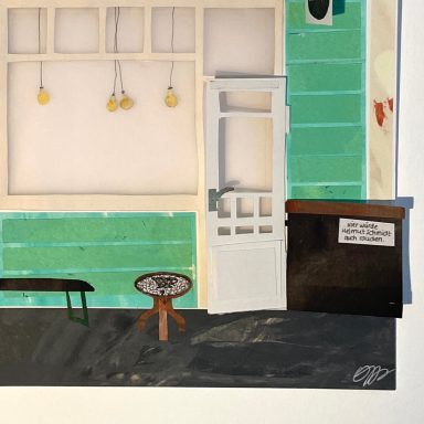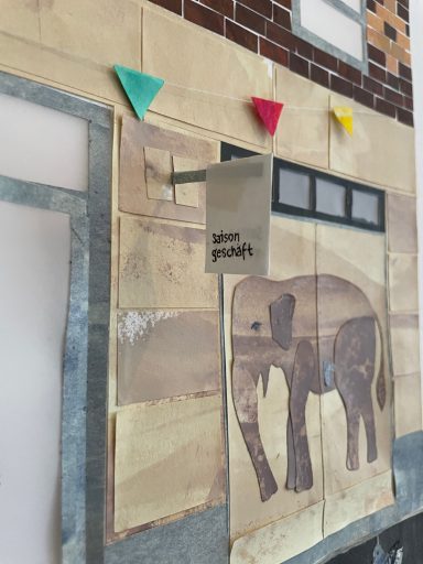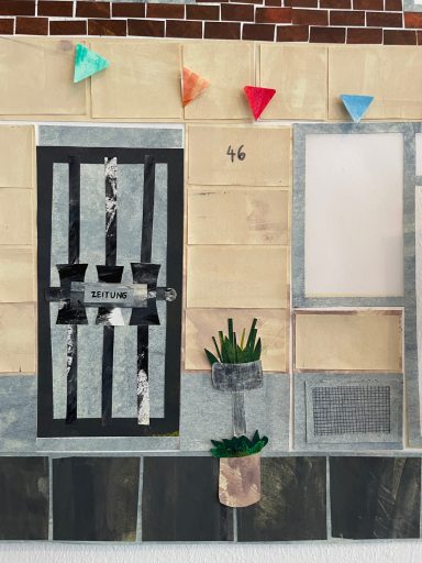 Besonders gerne widme ich mich mit meinen großen Collagen verschiedenen Orten, um diese abzubilden. Ich schaue mir die Orte vorher lange und ganz genau an, um dann die Strukturen der Hausfassade, der Möbel und Fenster zu malen. Mit Cutter und Schere entstehen dann Stück für Stück auch die vielen kleinen Details, welche die Collage dann vollenden.