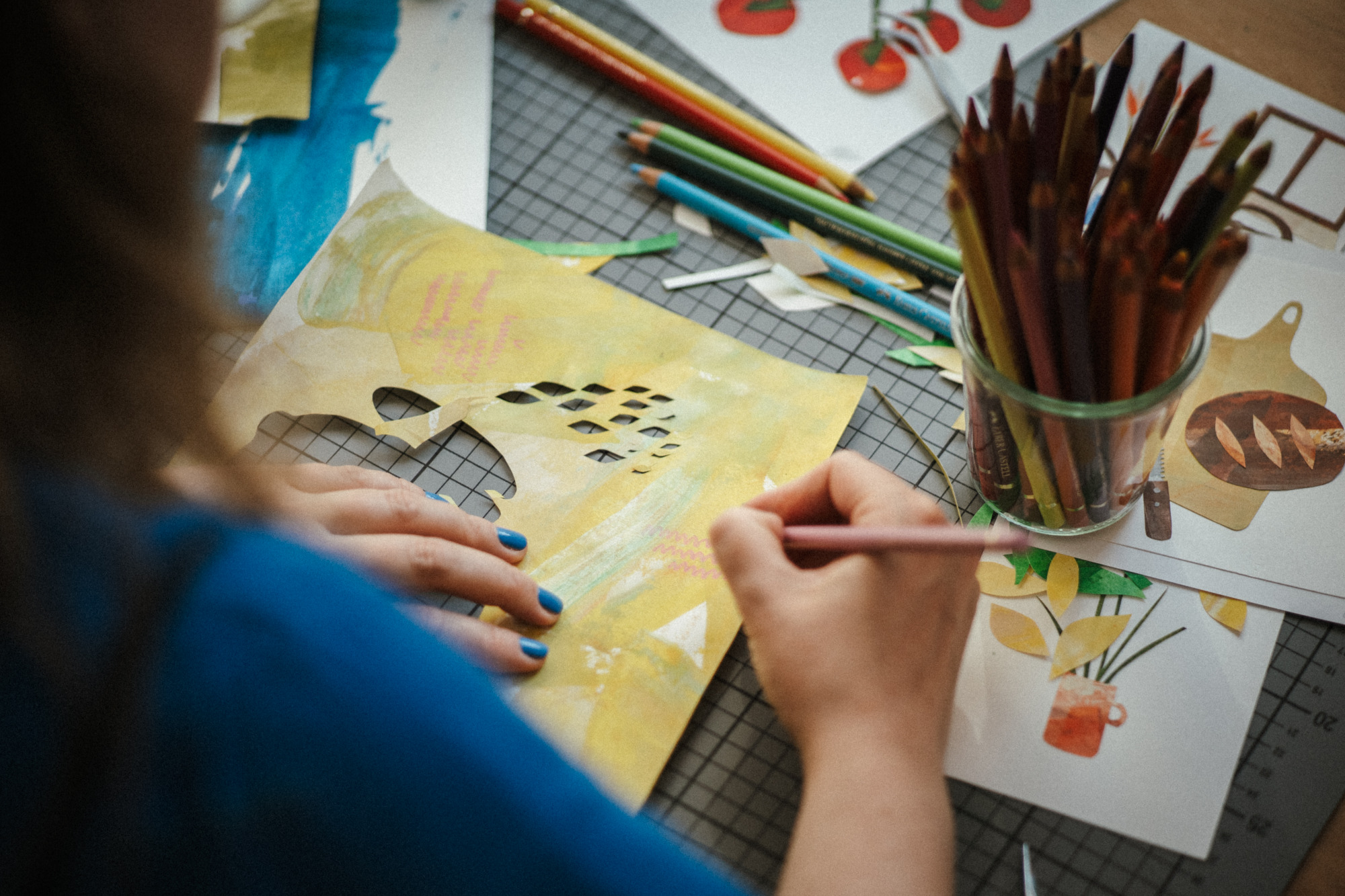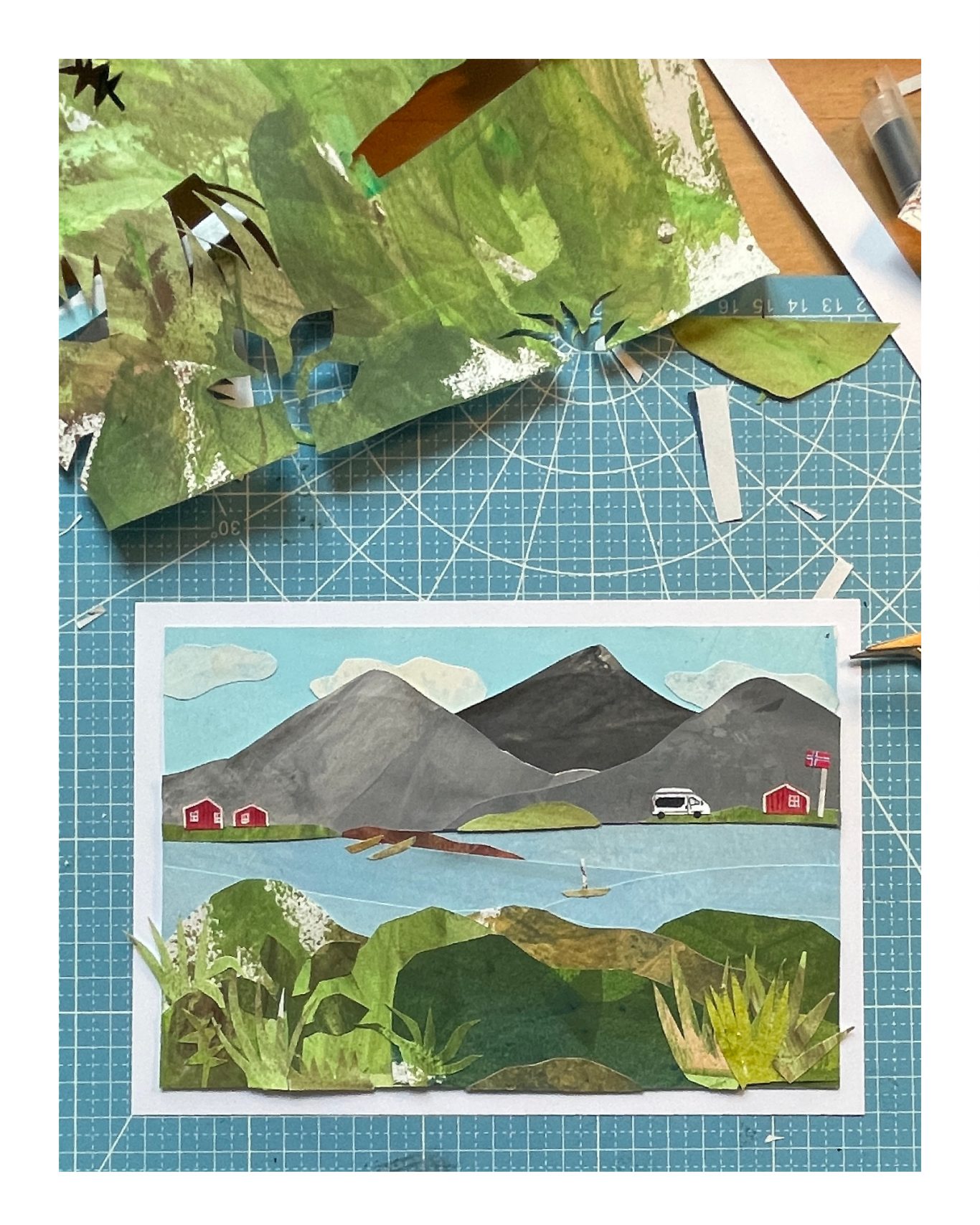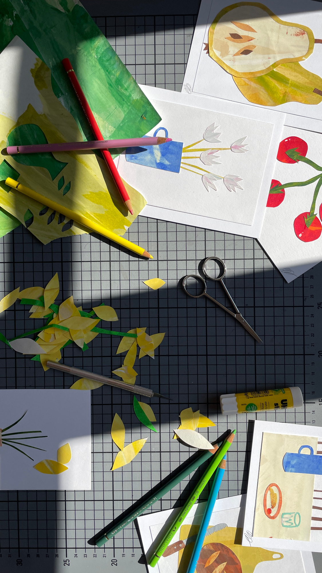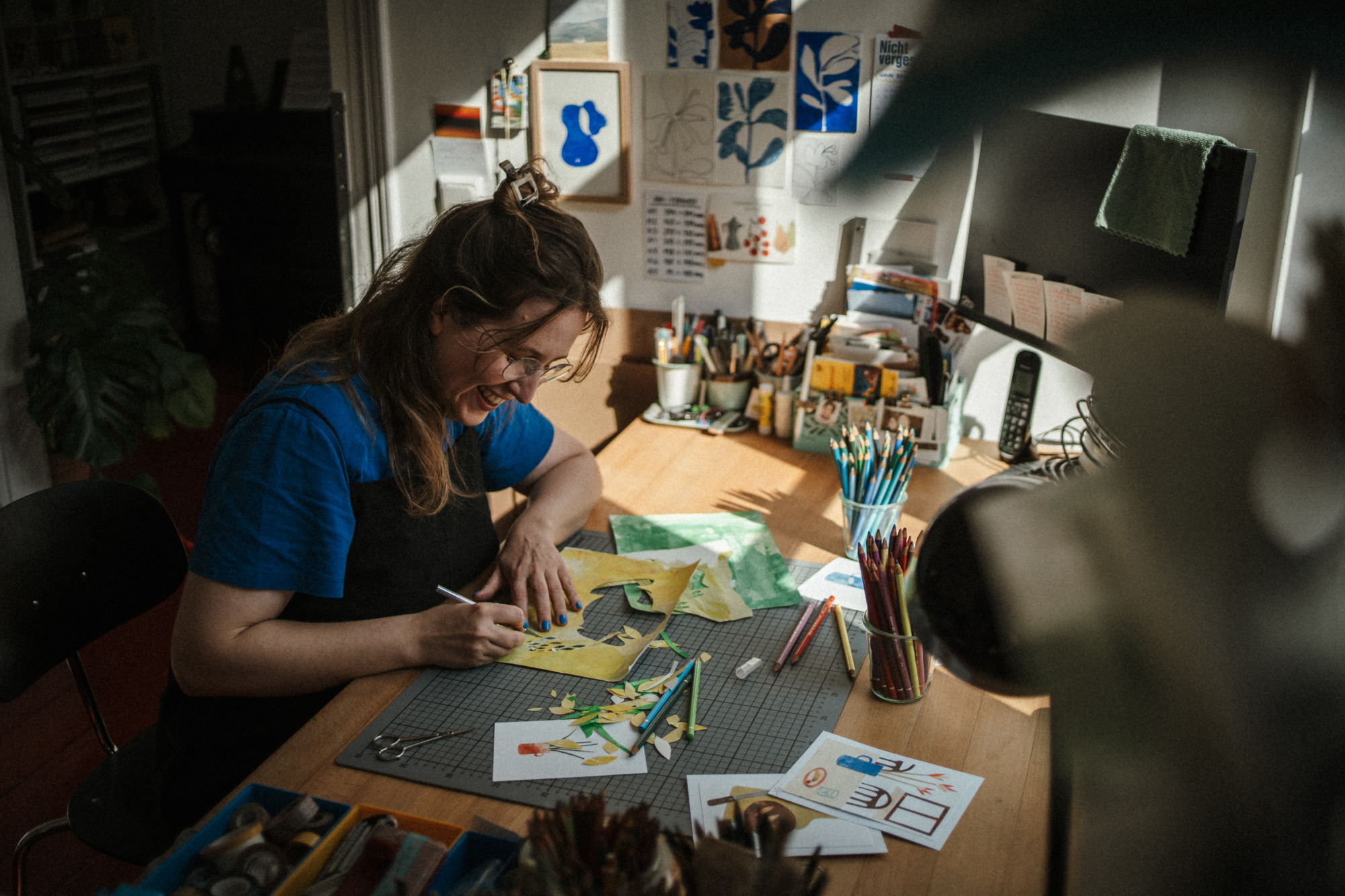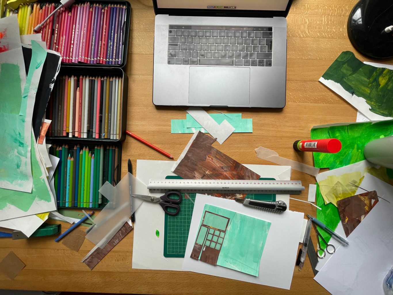 Besonders gerne widme ich mich mit meinen großen Collagen verschiedenen Orten, um diese abzubilden. Ich schaue mir die Orte vorher lange und ganz genau an, um dann die Strukturen der Hausfassade, der Möbel und Fenster zu malen. Mit Cutter und Schere entstehen dann Stück für Stück auch die vielen kleinen Details, welche die Collage dann vollenden.
