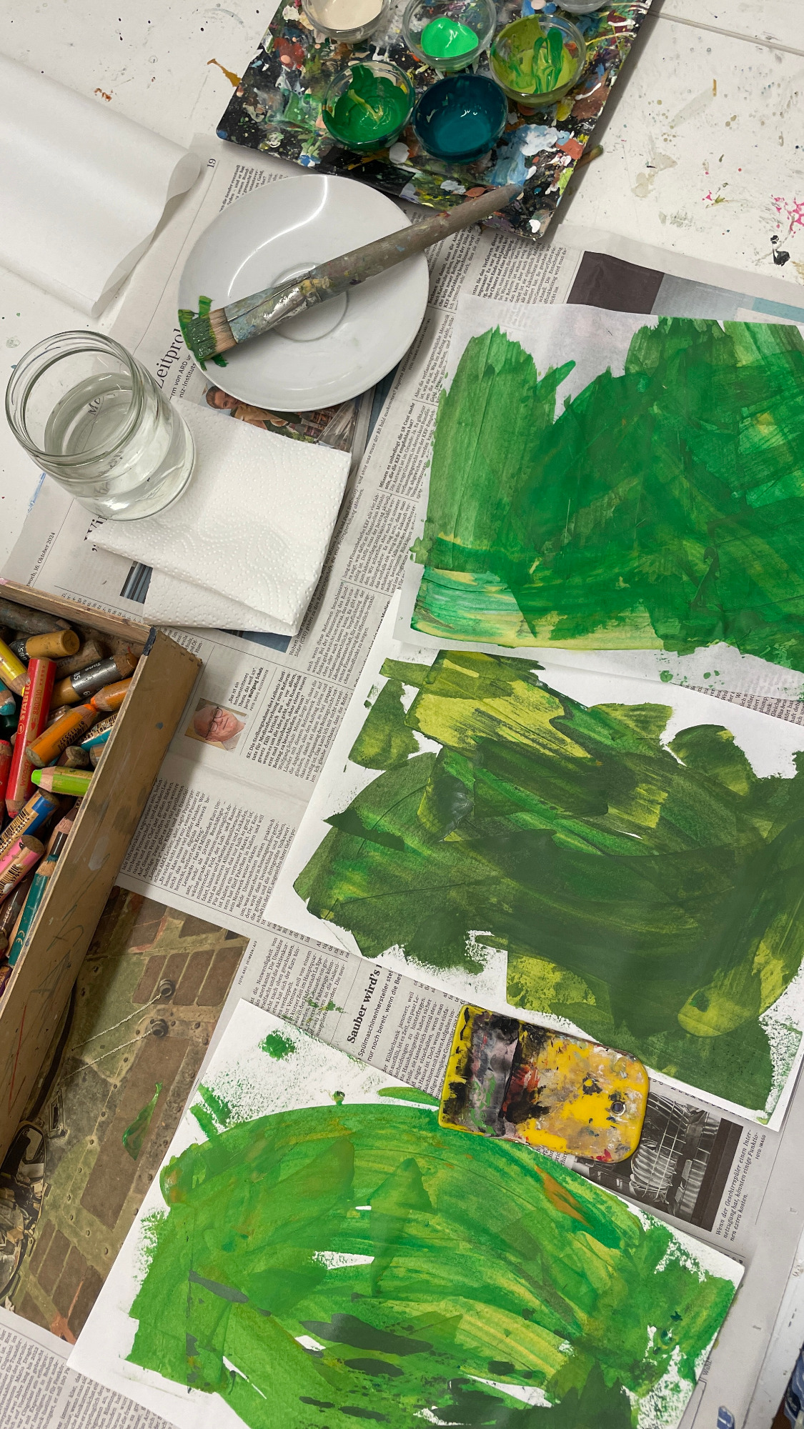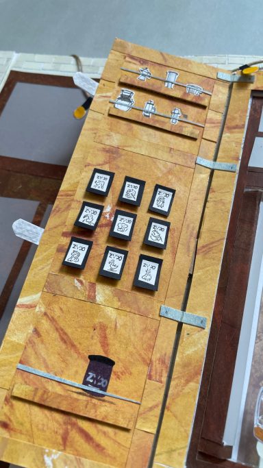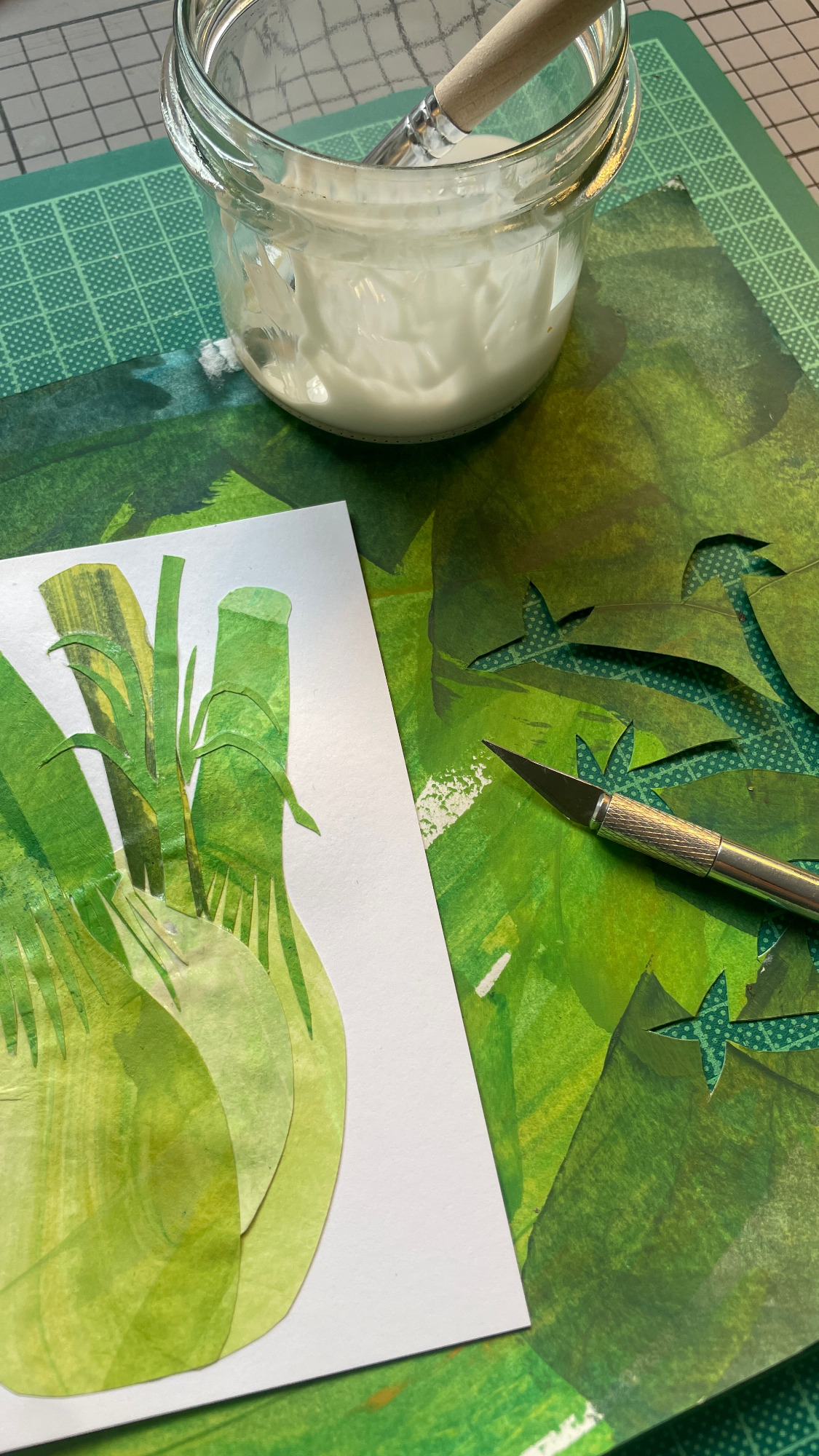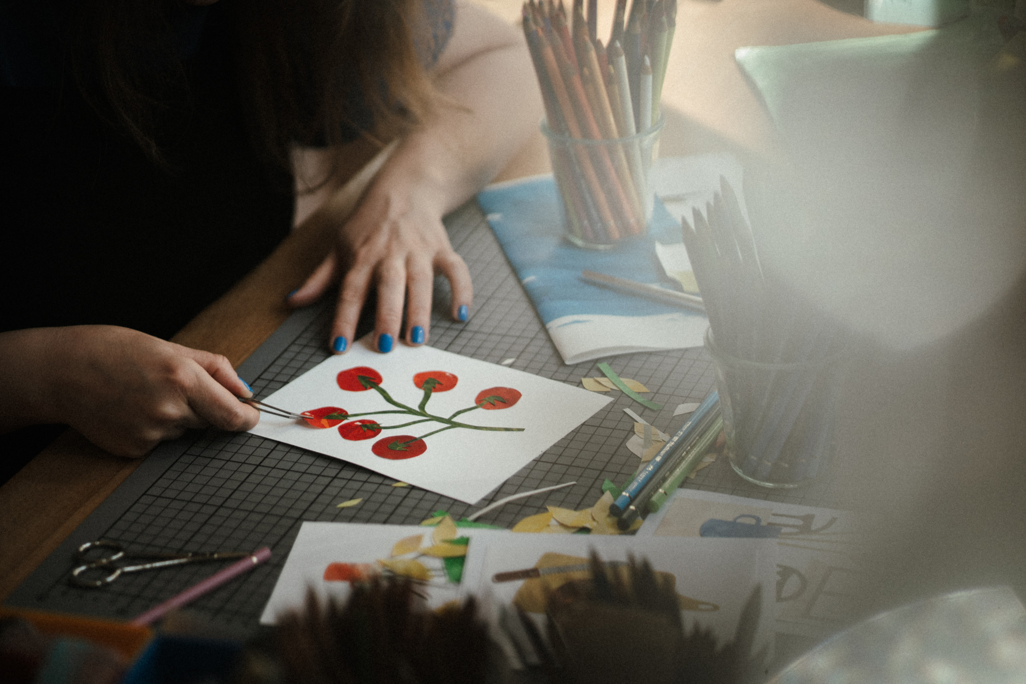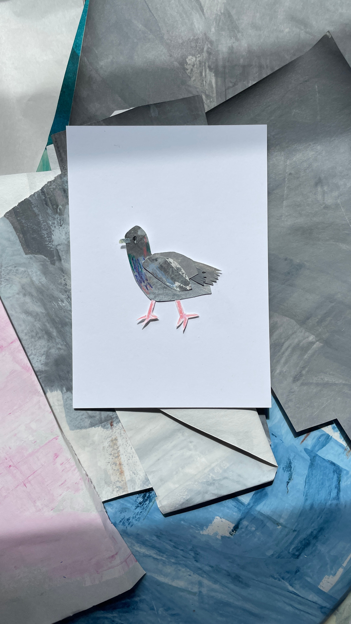 Besonders gerne widme ich mich mit meinen großen Collagen verschiedenen Orten, um diese abzubilden. Ich schaue mir die Orte vorher lange und ganz genau an, um dann die Strukturen der Hausfassade, der Möbel und Fenster zu malen. Mit Cutter und Schere entstehen dann Stück für Stück auch die vielen kleinen Details, welche die Collage dann vollenden.