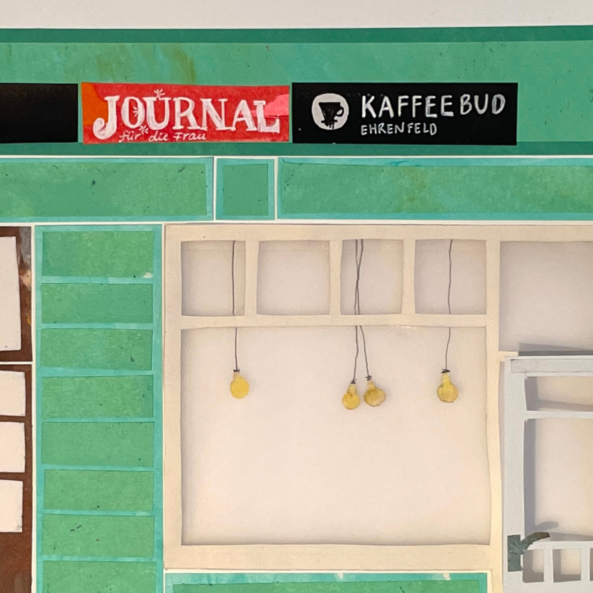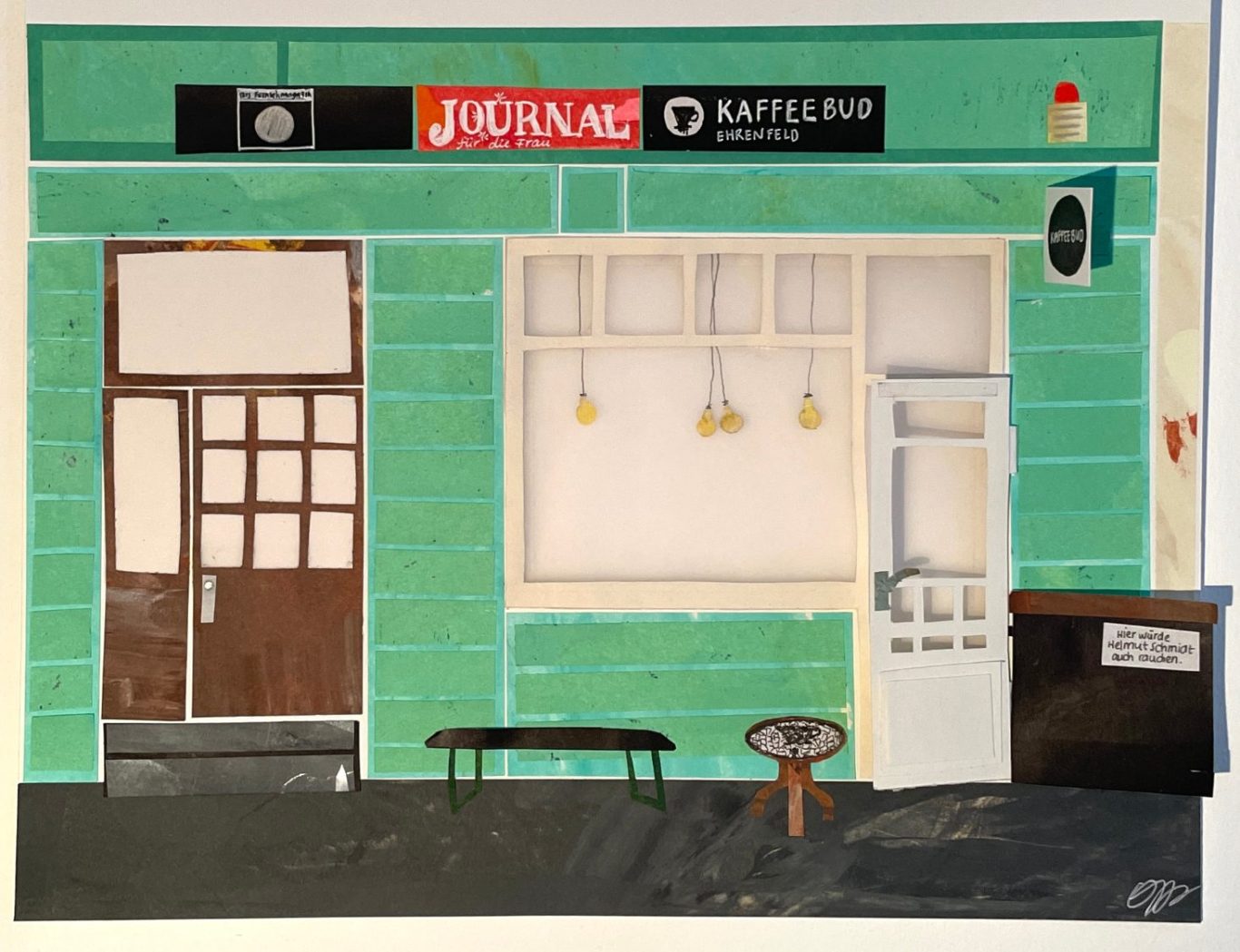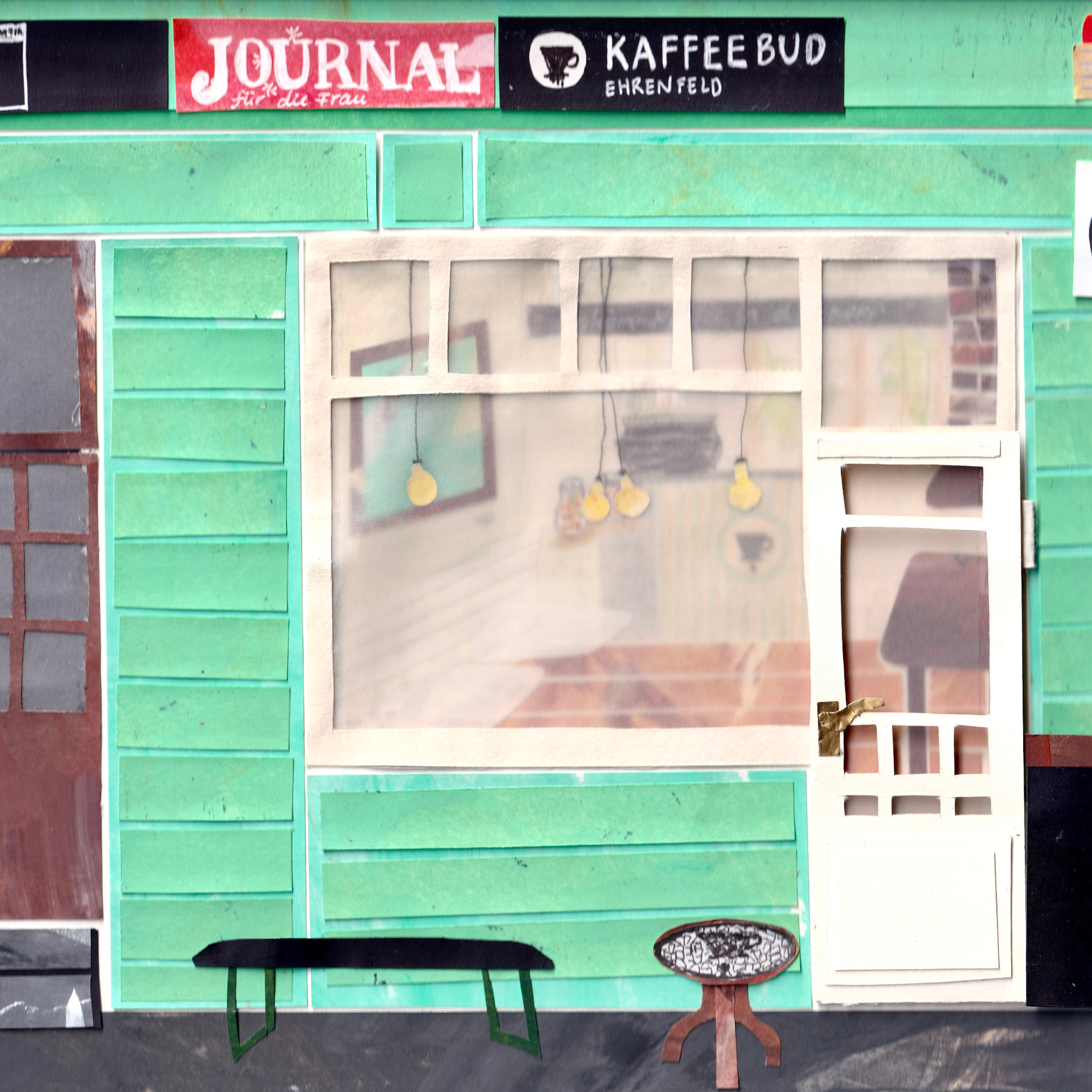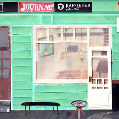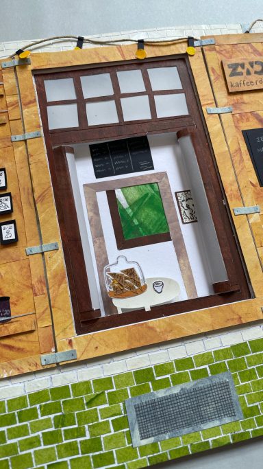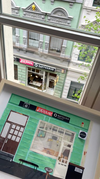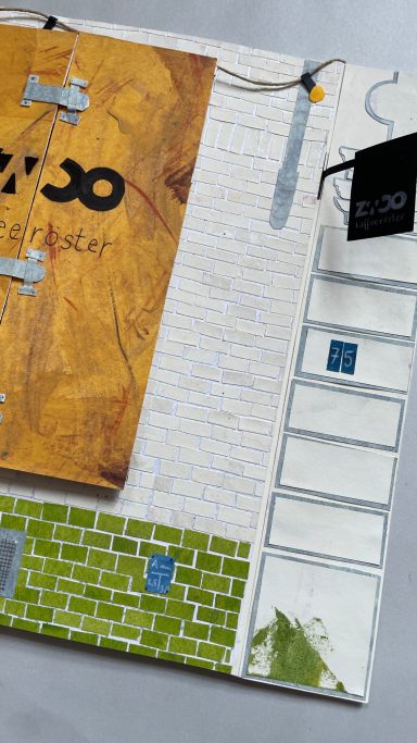 Ob im Sommer einen Kaffee auf der Bank und dabei das Treiben auf der Straße beobachten oder im Winter, wenn es draußen schneit, im Warmen sitzen und dabei den köstlichen Möhrenkuchen schmecken lassen. In der Kaffeebud fühle mich jederzeit pudelwohl. Sie war meine erste dieser Collagen und ich habe mich in all ihre vielen kleinen Details verliebt…