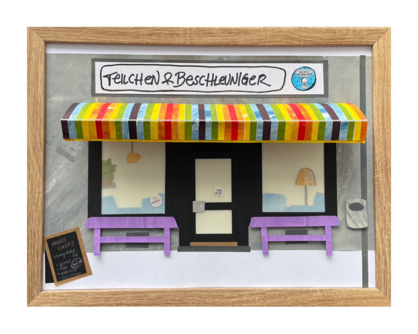 Diese Collage ist eine Erinnerung an das Teilchen & Beschleuniger, die köstlichen Bagel und meine Zeit in Münster, wo ich während meines Studiums für ein paar Jahre gewohnt habe. Hier habe ich viele schöne Momente verbracht, Freundschaften geschlossen, gelacht, Kaffee geschlürft. Besonders viel Spaß hatte ich mit der schönen, bunten Markiese, durch die man das Teilchen schon von Weitem erblicken kann…